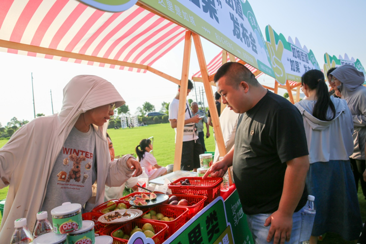 晶莹甜香的葡萄、皮薄汁丰的脆梨、“红得发紫”的如皋紫桃、“晒足720天,只有如城有”的老酱油……傍晚时分,“如果”主题农展汇热情“开市”,集聚了如城街道部分村(社区)代表性农特产品的28个展位一字排开,一位位农户、种植户化身“带货达人”,将最新鲜、最走俏的产品从“田间地头”带到百姓舌尖。