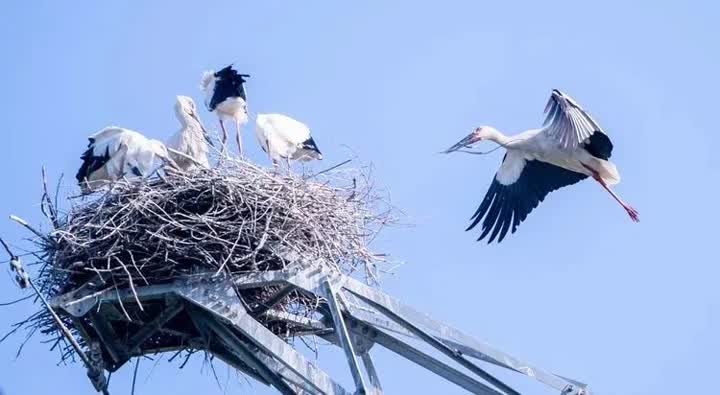 2024年1月15日 东方白鹳不负所盼、再次归来 可喜的是“鸟丁”兴旺 5只小宝宝成功孵出 健康长大 近日,“网红夫妇”东方白鹳一家 再次回归 夏去今又回 东方白鹳是国家一级保护动物 对于栖息地环境要求极高 他们通常在 远离人群的铁塔上筑巢繁衍 良好的生态、丰富的食物 让越来越多的东方白鹳选择在如皋 繁育后代 相信随着人们爱鸟、护鸟意识的提高 东方白鹳的繁殖栖息之所 一定会更好 更安全 欢迎回家