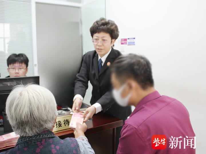 吕某(右一)通过执行法官向丛慧玉老人(左一)移交首笔还款