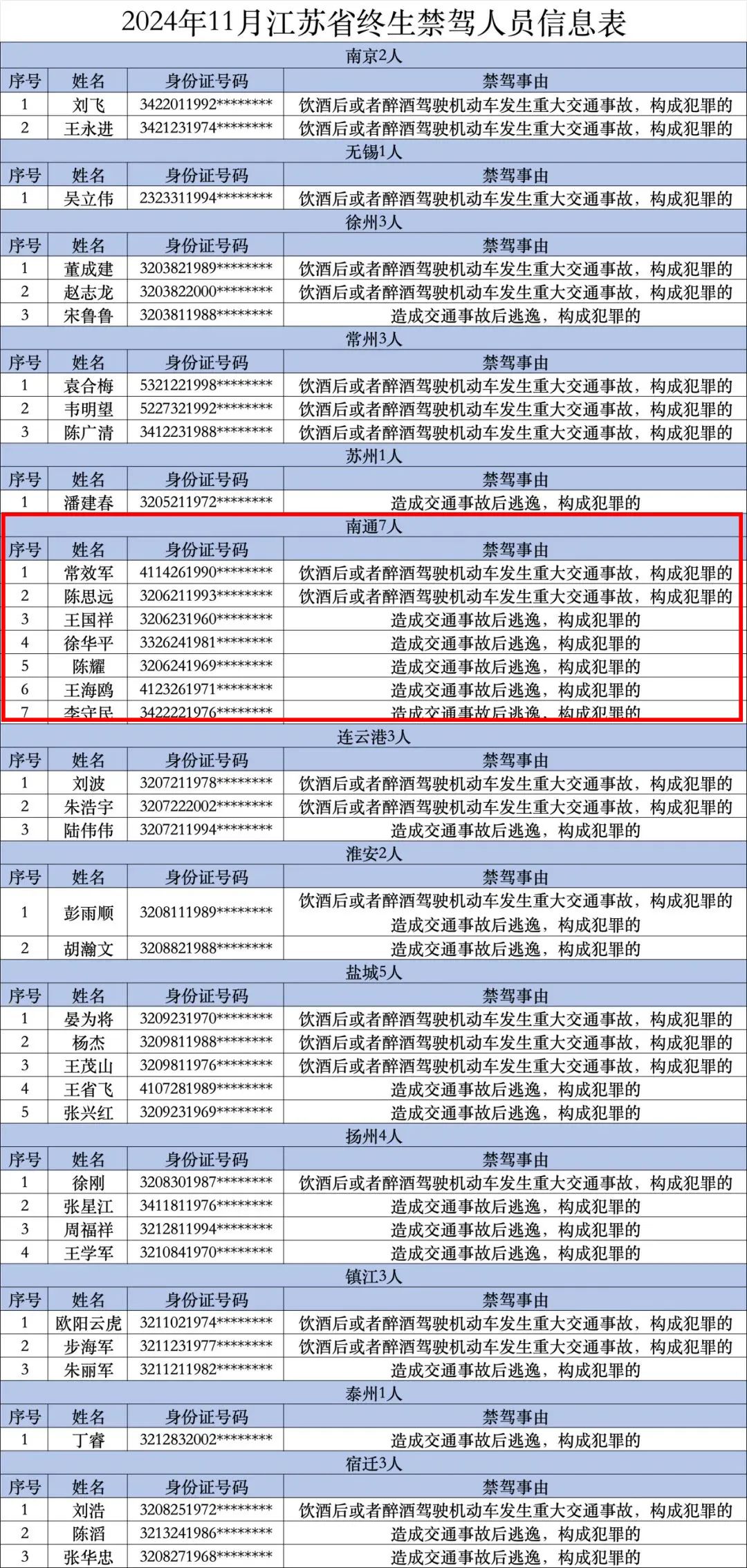 为全力以赴防风险除隐患、保安全保畅通,努力以高水平安全保障高质量发展。今年以来,江苏交警持续开展“五大曝光”行动,加大对严重交通违法犯罪行为的曝光力度,充分发挥教育引导、警示震慑作用。据统计,2024年11月,全省共计38人被依法吊销机动车驾驶证,且终生不得重新申领。现将名单予以曝光。