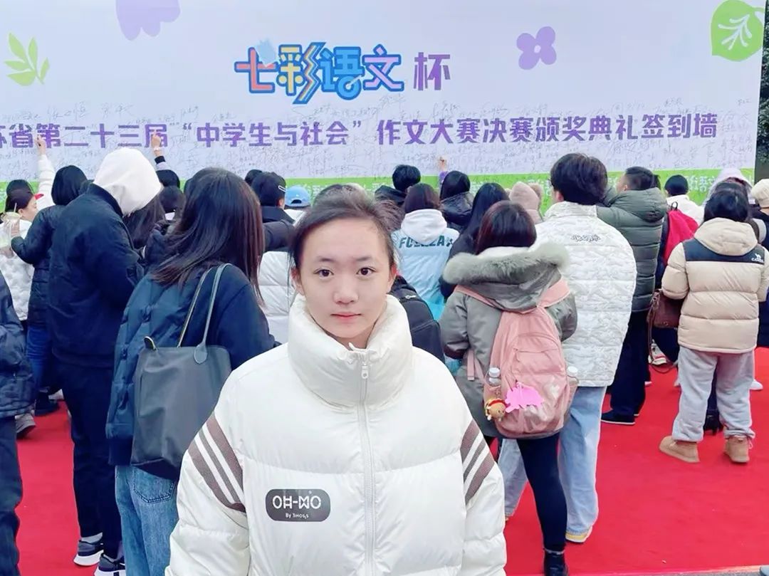 获奖感言 ▲江苏省如皋中学 顾彦哲 非常荣幸与幸运,能在这次比赛中获奖。能在比赛时有所生发和阐述,平时的阅读与思考无疑给了我很大的帮助。 我相信写作是一场思维的旅行游戏。你从文题出发,在思想中寻找模块,理性地组织文章的结构;创作时可以适当旁逸斜出,感性地生成自己的思考,阅读为这场旅行提供了启程的车票。我们常常喜欢为阅读赋予功利的意义,这当然也无可厚非,但其实阅读本身就可以是一桩两全其美的事。毛姆曾写:“阅读是一座随身携带的避难所。”阅读时,让自己脱离目的而着眼于过程,听从内心的声音,在无数个或现实或浪漫的世界中徜徉,毫无压力的遐思往往更能使你触碰到内心的真实,与作者真正想要表达的思想同频共振。这种共振绝非转瞬即逝,它会在不经意间温润你的潜意识,内化为笔下的文字;不从功利角度出发,或许反而也实现了所期望的功利价值。 当然人生绝非仅有功利的肆虐横行。写作是一件需要静心的事,绝不是哗众取宠的口号与资本。给好书一个机会,给思想一点时间,在紧张的学习之余,不妨停下脚步,把自己变成一个客观的思考者。你可以冥想生活车轮的运转,可以思想社会机器的运作,可以怀想星球轨迹的运行。我们热爱文学并非只是因为那一缕缕飘逸的墨香和获得新知后的满足感,更是流连于那无数个由想象、情感和哲思生成的世界。它们吸引着我们的目光,也丰盈着我们自己的内心世界,与外部达成久违的和解。 最后,再次感谢我的老师、家人和朋友,是他们给了我莫大的帮助。一方面赛场上时间紧张,行文略显仓促,另一方面考场作文和赛场作文的思路也大相径庭。前方的道路虽很漫长,但如黑塞所言,只要内心存在着既定的轨道,“一切极端与对立都告消失之处,即是涅槃。” ▲如皋初级中学 丁汝怡 写作,于我而言,更像一个熟悉的朋友。从小学起无数的文字流淌于笔尖,编织成一个个美丽的梦;到了初中,在老师的指导下,我阅读的书籍种类更多样,语言更多元化,思想更成熟。 写作,又是一场心灵的旅行,也是一次自我发现的奇妙旅程。每当我提起笔,那份源自内心深处的情感便如泉水般涌动,流淌在字里行间,形成一篇篇承载着思想与情感的文字。 本次大赛中,我选择了《我养了一首诗》这一题目,撷取旅行中三个片段,描绘了一首充满生活气息与蓬勃生命力的诗。写作过程中,我将自己的情感、思考融入文字之中,真正做到了"我手写我心"。 写作是心灵的抒发与自我表达,那些平时难以言表的思绪,在写作时仿佛找到了出口,它们会化作文字,自由地跳跃在纸上,让我们得以清晰地审视自己的内心世界。 新闻多一点 一年一度的“七彩语文杯”江苏省“中学生与社会”作文大赛,是江苏省最高级别作文赛事,历来备受关注。参赛选手都是经过各个大市现场作文的层层选拔,才能站上最终的决赛舞台。 在比赛过程中,正如“中学生与社会”这个大赛主题,学生们不再是书本知识的被动接受者,而是主动出击者,用自己的眼睛去观察,用心灵去感知社会的脉搏。 因此,这场作文比赛不仅仅是对中学生文学才华的一次展示,更是一次对他们社会责任感、公民意识以及综合能力的全面培养,对青少年关注社会发展,成为主动的阅读者、思考者、书写者提出极高要求。